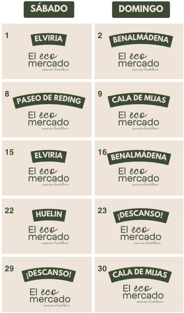 CALENDARIO Somos tu mercado de confianza próximos mercados Ecológicos Elviria - Avenida de España 1 de Noviembre 9:00 – 14:00 Ubicación 1 De Noviembre 2 De Noviembre Benalmádena - Recinto Ferial La Paloma 2 de Noviembre 9:00 – 14:00 Ubicación Paseo de Reding 8 de noviembre 9:00 – 14:00 Ubicación 8 De Noviembre Apúntate las próximas fechas Nuestro Calendario De Noviembre Cala De mijas Ubicación Huelín Ubicación Paseo de Reding Ubicación